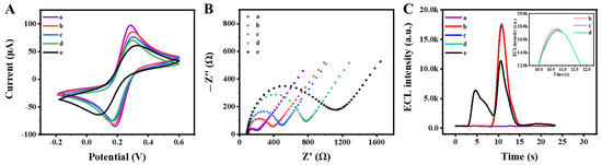To explore the assembly process of the ECL aptasensor, cyclic voltammetry (CV) and electrochemical impedance spectroscopy (EIS) were utilized to study the electrochemical properties. As shown in Figure 4A, the bare GCE exhibited a pair of reversible oxidation-reduction peaks (curve a). Upon modification with Zr MOF-PEI, the peak current was observed to decrease (curve b). Following the addition of the aptamer for KAN, the peak current exhibited further reduction (curve c). The subsequent binding of KAN to the aptamer significantly lowered the peak current (curve d). Finally, upon modification with the Luminol–Apt probe, the peak current experienced another decrement (curve e). The EIS spectra in Figure 4B showed a gradual increase in the electron transfer resistance (Rct) value at each step of the modified electrode (curves a–e), thus confirming the successful fabrication of the ECL aptamer sensor.