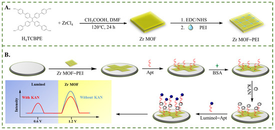 In recent years, the rapid development of materials science has promoted the continuous progress of ECL, and the emergence of various luminescent materials has provided a broad space for developing dual-signal ECL sensors. Metal–organic frameworks (MOFs) have shown significant potential [25,26,27,28,29]. These crystalline structures consist of metal ions or clusters self-assembled with organic ligands, possessing a distinctive porous structure and tunability, which have advantages in the construction of sensors. In particular, zirconium-based MOFs (Zr MOFs) have garnered considerable attention due to their exceptional chemical stability and tunable porosity and have gradually occupied an important position in the construction of ECL sensors [30,31,32]. Compared with other nanomaterials, Zr MOFs exhibit superior chemical robustness under harsh environmental conditions, ensuring the long-term stability of the sensor. Additionally, the high surface area and abundant coordination sites of Zr MOFs provide ample space for co-reactant immobilization, thereby enhancing the interaction between luminophores and co-reactants. More importantly, the covalent coupling of PEI with a Zr MOF significantly shortens the electron transfer distance, which not only enhances the ECL efficiency but also reduces the interference of additional reagents in the detection environment. These features highlight the remarkable potential of Zr MOFs in constructing self-enhanced and competitive dual-signal ECL sensors.