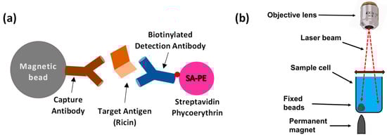 Here, tosylactivated M280 magnetic beads (Dynabeads M-280, #14203, Thermo Fisher Scientific, Waltham, MA, USA) were conjugated to either MH1 or MH75 anti-ricin antibodies (IIBR, Ness Ziona, Israel) following the manufacturer’s protocol []. Biotinylated MH1 or MH75 anti-ricin antibodies (Figure 1a) were used as detection antibodies, and streptavidin R-phycoerythrin (SA-PE) complex solution (#PJRS20-1, Agilent, Santa Clara, CA, USA) was employed as the fluorescent marker. The assay buffer comprised 0.5 g of bovine serum albumin (#A7030-50G, Merck, KGaA, Darmstadt, Germany), 5 mL of phosphate-buffered saline (PBS; PBSX10-Mg, -Ca, pH 7.4, #BP729/1LD, Hylabs, Park Tamar, Rechovot, Israel), 45 µL of deionized distilled water, and 25 µL of Tween-20 (#P1379, Merck, KGaA, Darmstadt, Germany).
