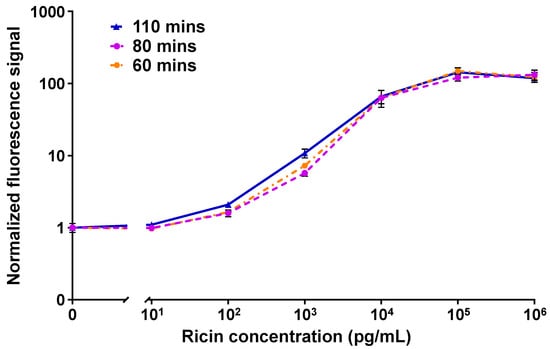 To reduce the assay turnaround time without compromising effectiveness, we performed a dose–response analysis in 50% plasma using two incubation steps (instead of three) and a shorter incubation time in each step. The incubation times of the first step were either 60 or 45 min, and the incubation times of the second step were 20 or 15 min, for total turnaround times of either 80 or 60 min. The assay included ~30,000 magnetic beads conjugated to MH1 anti-ricin antibody in assay buffer that were added to each sample well. After removing the buffer solution, we added 10 µL of plasma, 5 µL of assay buffer containing increasing concentrations of ricin protein (0, 1 × 101, 1 × 102, 1 × 103, 1 × 104, 1 × 105, and 1 × 106 pg/mL), and 5 µL of biotinylated MH75 anti-ricin antibody, diluted to 2 µg/µL, and incubated for 60 (or 45) minutes. After a single washing step and buffer removal, the beads were incubated for 20 (or 15) minutes with 100 µL of SA-PE complex solution at a concentration of 2 µg/µL. Following the final buffer replacement, the beads were analyzed using the OMBi system.