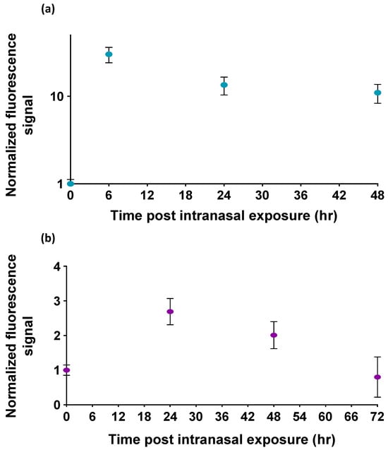 The normalized fluorescence signals of the OMB-based ricin assay for bronchoalveolar lavage fluid samples are shown in Figure 4a. The fluorescence signals detected at 6, 24, and 48 h post exposure are approximately 10–30 times higher than the signals observed in mice not exposed to ricin. Similarly, the normalized fluorescence signals for serum samples are presented in Figure 4b. The fluorescence signals detected at 24 and 48 h post exposure are significantly higher—2.4 and 2.0 times, respectively—than the signal from non-exposed mice (p-value < 0.00015). However, the fluorescence signal detected at 72 h post exposure is not significantly different from the signal observed in non-exposed mice.