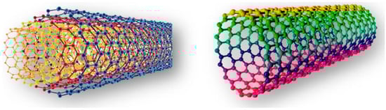 Carbon nanotubes (CNTs) are one of the most extensively studied nanomaterials due to their exceptional electrical, mechanical, and thermal properties [11]. Structurally, they are composed of rolled-up graphene sheets, forming hollow cylindrical tubes with nanometer-scale diameters and micrometer-scale lengths. Depending on their structure, CNTs can be classified as single-walled CNTs (SWCNTs) or multi-walled CNTs (MWCNTs) (Figure 1). SWCNTs consist of a single graphene layer and exhibit unique electronic properties governed by their chirality, allowing them to behave as either metallic or semiconducting materials. In contrast, MWCNTs comprise multiple concentric graphene cylinders and generally possess superior mechanical strength with metallic conductivity [12]. Due to their remarkable properties, CNTs have found extensive applications in fields such as nanoelectronics [13], biosensors [14], composite materials [15], and energy storage [16].