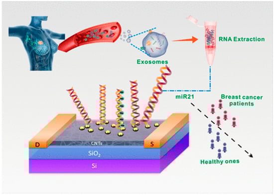 Graphical representation of the ultrasensitive detection of exosomal miR-21 employing a DNA-functionalized CNT-FET biosensor (reproduced with permission from [48]).