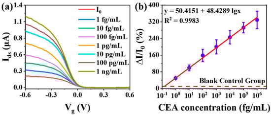Detection of CEA using the proposed CNT-FET biosensor with an undulating interface in a complex matrix: (a) The transfer characteristics of the CNT-FET biosensor were systematically monitored in a 10% fetal bovine serum (FBS) matrix following the addition of CEA at concentrations ranging from 1 fg/mL to 1 ng/mL, demonstrating the sensor’s performance in biologically relevant conditions. (b) Corresponding calibration curves illustrating the relative current change (ΔI/I0) as a function of increasing CEA concentration were generated, with error bars representing the standard deviation across eight independently fabricated devices (n = 8), underscoring measurement reproducibility and device reliability (reproduced with permission from [5]).
