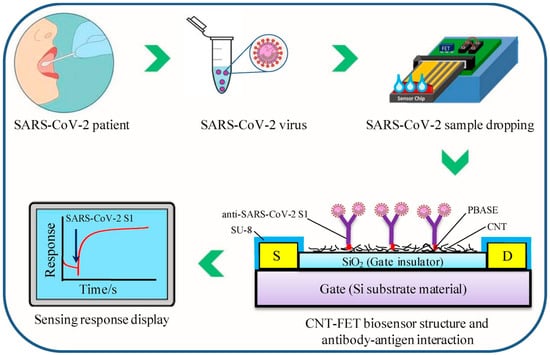 A schematic representation of the CNT-FET biosensor and the testing procedure for SARS-CoV-2 S1. The sensor utilizes SWCNT as the sensing nanomaterial, with anti-SARS-CoV-2 S1 immobilized on the CNT via the PBASE linker. The detection mechanism relies on changes in electrical signal properties induced by the interaction between the biosensor and the SARS-CoV-2 spike protein (reproduced with permission from [47]).