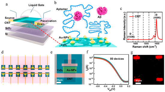 Development and analysis of the CNT-FET biosensor. (a) Conceptual representation of an aptamer-modified CNT-FET biosensor designed for detecting AD serum biomarkers. (b) Schematic depiction of the immobilization process, wherein an aptamer probe is anchored onto FG via a conventional Au linker, subsequently enabling hybridization with Aβ peptides. (c) Raman spectroscopy image illustrating the distribution of sorted CNTs. (d) Scanning electron microscopy (SEM) image displaying the CNT-FET biosensor array, with a scale bar of 100 μm. (e) SEM image highlighting the core active region of the biosensor, with a scale bar of 20 μm. (f) Transfer characteristics of 80 CNT-FETs under liquid-gated conditions following the deposition of Au nanoparticles, measured at Vds = −0.1 V. (g) Fluorescence microscopy image revealing Cy5-labeled Aβ42 aptamers hybridized to Au-NPs immobilized on the CNT-FG-FET channel surface (reproduced with permission from [54]).