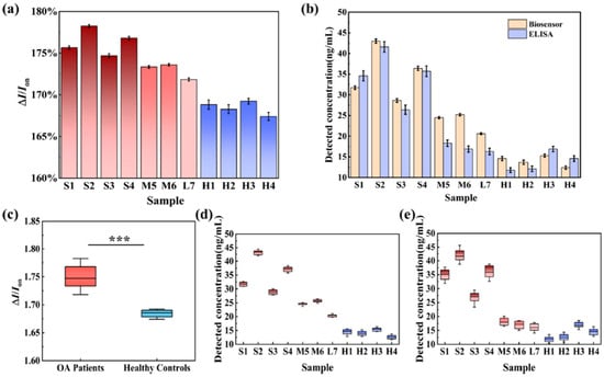 Detection of CRTAC1 protein: (a) The biosensor’s response was evaluated using clinical serum samples from patients with severe (S1–S4), moderate (M5–M6), and mild (L7) osteoarthritis (OA), as well as from healthy individuals (H1–H4), with each group comprising 10 replicates (n = 10). (b) A comparative analysis was conducted between CRTAC1 concentrations measured by the biosensor and those determined via ELISA. (c) A statistically significant difference in biosensor signal intensity was observed between OA patients and healthy controls (n = 10), with p < 0.001. Results are expressed as mean ± standard deviation (SD). (d,e) Quantitative detection of CRTAC1 levels in serum samples using the biosensor (d) and ELISA (e). Box plots represent interquartile ranges (25th to 75th percentiles), with whiskers indicating the 10th to 90th percentiles; medians are denoted by horizontal lines within the boxes (reproduced with permission from [55]).
