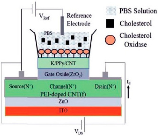 Keshwani et al. [49] developed an innovative ion-sensitive FET biosensor for cholesterol detection utilizing CNTs with high-κ dielectric properties. They fabricated the device through solution-based fabrication methods, incorporating polyethylenimine-doped CNTs as the conductive channel and a nanocomposite membrane consisting of potassium-doped nanotubes with polypyrrole (Figure 9). Following the immobilization of cholesterol oxidase enzymes in phosphate-buffered saline solution, a comprehensive electrical characterization revealed the biosensor’s exceptional performance characteristics. The platform demonstrated broad linear detection range capabilities coupled with significant sensitivity parameters and rapid-response kinetics. A systematic evaluation confirmed the device’s long-term operational stability and excellent molecular discrimination properties, as evidenced by minimal interference from competing analytes. These findings established the CNT-FET architecture as a promising analytical platform for cholesterol monitoring applications, combining the advantages of nanomaterial-enhanced sensitivity with robust biosensing performance.