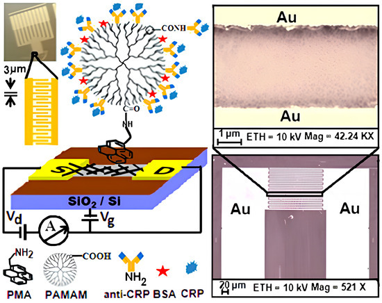 Rajesh et al. [56] reported the fabrication of an SWCNT-based FET that was surface-functionalized using a polyamidoamine (PAMAM) dendrimer featuring 128 terminal carboxyl groups, which served as anchoring sites for the site-specific immobilization of anti-C-reactive protein (anti-CRP) antibodies (Figure 10). Upon exposure to varying concentrations of C-reactive protein (CRP), a clinically relevant, concentration-dependent reduction in the drain current was recorded, with the sensor exhibiting a limit of detection around 85 pM. The system demonstrated a sensitivity of approximately a 20% change in normalized current (ΔI/I) per logarithmic unit of CRP concentration, consistent with the localized gating of the SWCNT channel induced by the antigen–antibody interaction. Furthermore, the calculated dissociation constant (Kd = 0.31 ± 0.13 μg/mL) indicated a strong binding affinity between the FET-bound antibodies and CRP, attributed to the high-density and spatially favorable orientation of capture probes enabled by the 3D PAMAM dendritic scaffold.