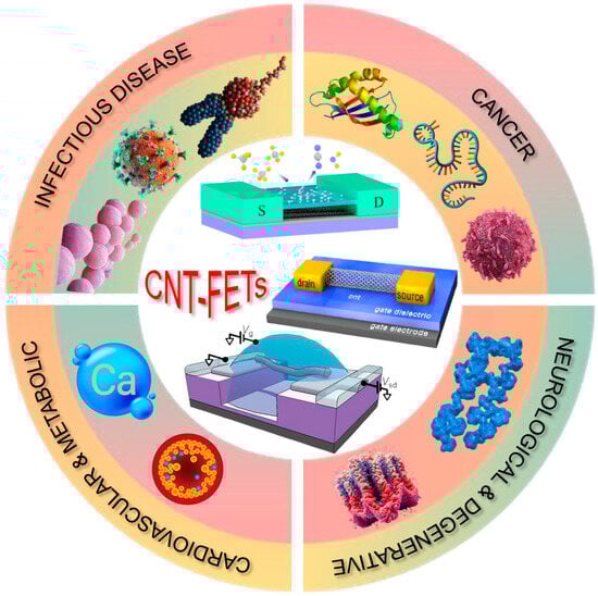Overview of CNT-FET-based biosensors for detecting biomarkers across major disease categories, including infectious, cancerous, neurological, and cardiovascular/metabolic disorders.