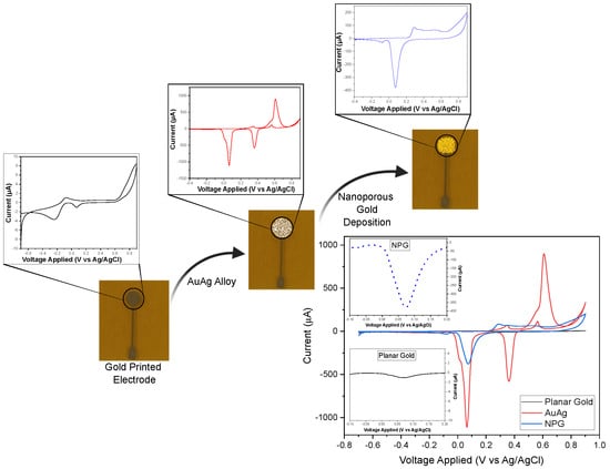 Previously to the analysis of nitrate and nitrite, unmodified gold-printed electrode surfaces of 2 mm in diameter were characterized using 1 M NaOH with CV, sweeping the potential from −0.7 V to 0.9 V at a scan rate of 10 mV/s. Following this, a nanoporous gold (NPG) deposition process, adapted from [], was initiated due to its reported advantages in enhancing nitrite detection []. A gold–silver (AuAg) alloy was deposited onto the gold-printed electrode in a cyanide bath (20 mM  and 100 mM  in 250 mM ) via chronoamperometry (CA) at −1.19 V for 180 s. The silver was then removed by submerging the electrode in 25% nitric acid for 30 min. A CV scan in 1 M NaOH was performed at each step for characterization, as illustrated in Figure 1.