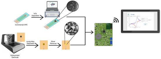 Prior to the analysis of pH, the SPEs were functionalized with an iridium oxide (IrOx) sensing layer. The IrOx functionalization process used was previously described in [], and consisted of 80 Cyclic Voltammetry (CV) scans with a potential range from −0.7 V to 0.6 V at a scan rate of 10 mV/s.