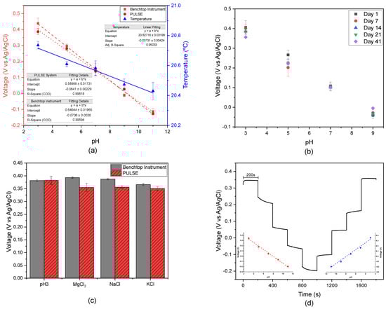 OCP measurements were conducted on artificial ISF with various pH values. The purpose was to investigate the pH behaviour of complex solutions and benchmark the PULSE against the benchtop instrument. Simultaneously, temperature measurements were taken using a thermistor connected to the PULSE system. In Figure 3a, the calibration curves obtained from both systems are illustrated, along with the corresponding temperature measurements. The regression analysis conducted with the PULSE system revealed a slope of −64.1 mV/pH with an  value of 0.996, which is close to the ideal −59 mV/pH, according to the Nernst Equation []. Consequently, the accuracy of the measurement performed by the PULSE was 91.4%. Similarly, for the benchtop potentiostat, the regression analysis yielded a Nernst response with a slope of −70.6 mV/pH and an  value of 0.996. The results showed a strong correlation (>0.99) between the datasets from the benchtop instrument and the PULSE, highlighting the PULSE’s potential as an alternative for pH sensing in complex media. Furthermore, the temperature measurements exhibited a linear response as described in the literature [], showing a slight decrease as the pH increased.