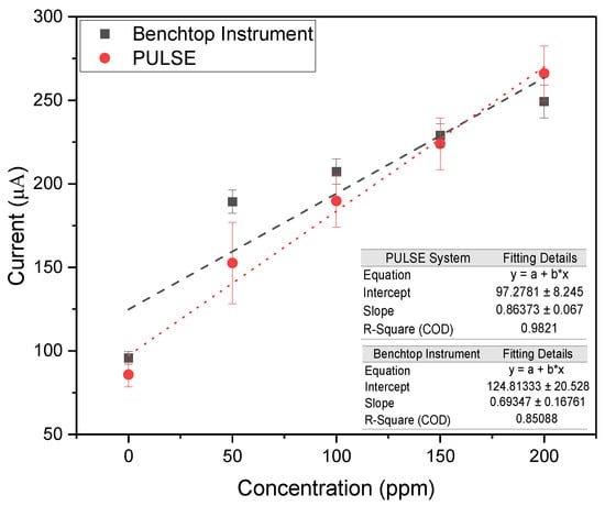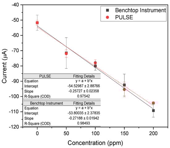 Calibration plots of peak oxidation currents for varying nitrite concentrations in PBS measured with the benchtop instrument and the PULSE system (n = 3, mean ± SD).