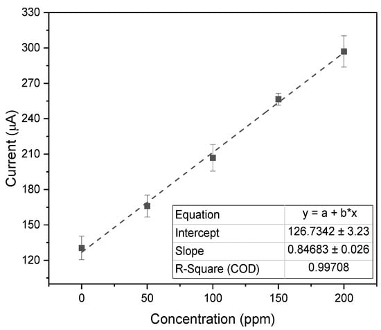 Subsequent analyses were performed in artificial ISF. Nitrite concentrations varied from the control (artificial ISF and 0 ppm of nitrite) to 200 ppm of nitrite. A calibration plot compared the measured current against the nitrite concentration, as depicted in Figure 6. The system exhibited high linearity, with  of 0.997, a LOD of 39.27 ppm (0.854 mM), and a sensitivity of 6.32  (0.291 ).