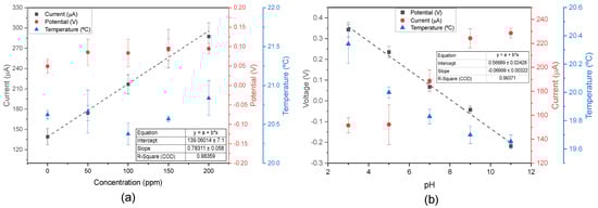 In contrast, Figure 7b illustrated the behaviour of a 100 ppm nitrite solution across varying pH levels. According to the nitrite calibration curve in artificial ISF at pH 7.5 (Figure 7a), the measured current at 100 ppm was 206.97 A. At pH 7.0, the measured current was 188.72 A, representing a small difference of 18.25 A. This discrepancy can be attributed to variations in pH and sensors. Even in more acidic solutions, the nitrite peak oxidation remained detectable, despite being reduced. Nitrite peak oxidation exhibits pH-dependent behaviour, decreasing in acidic conditions and increasing in basic environments, as previously reported in the literature []. In the future, more in-depth studies on nitrite and pH should be conducted to create a matrix that uses different nitrite calibration curves based on pH levels. The pH detection remained unaffected, and a calibration curve with a slope of −69.9 mV/pH was established, following a Nernst behaviour []. Additionally, the literature supported the observation that temperature decreases with increasing pH [].