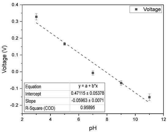 To evaluate the system performance in a dynamic environment, artificial ISF solutions with different pH levels were prepared. OCP measurements were conducted for 200 s in each solution, with the pH values incrementally increasing from 3.0 to 11.0 and then decreasing back to 3.0. Figure 3d illustrates the distinct voltage changes observed each time the solution’s pH was altered, giving it a stair shape. In some instances, the readings required a brief period to stabilize after the change, due to the sensor’s behaviour. Calibration curves were constructed for both the increasing and decreasing pH scenarios, resulting in slopes of −66.56 mV/pH and 68.72 mV/pH, respectively. In both situations, the calibration curves are consistent with Nernstian behaviour []. These findings suggested that the measurement system can accurately measure pH.