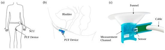 (a) Front view showing apparatus worn by the subject, (b) Left lateral schematic showing the PUF placement over the female urethral meatus, (c) Sagittal cross-sectional view of the PUF device [27].