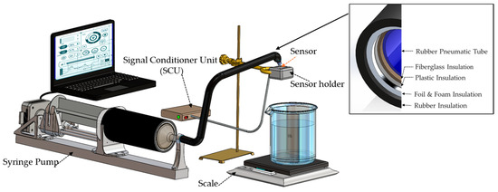 The system underwent optimization and performance enhancement prior to the calibration phase, which involved a series of experimental tests using the setup depicted in Figure 2, simulating human body conditions. To do so, a two-gallon, temperature-controlled water bath (PolyScience, Niles, IL, USA) was used to maintain temperatures between 35 °C and 39 °C. Thermal insulation was applied to the syringe and fluid delivery pipes in the test setup to maintain temperature stability throughout each measurement cycle. As shown in the inset of Figure 2, this insulation included rubber pneumatic pipes, fiberglass, plastic, aluminum foil, foam, and additional rubber layers.