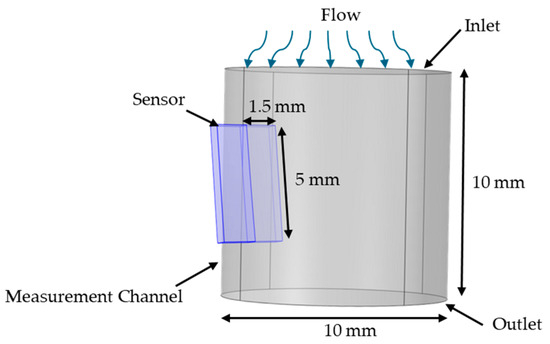 The CFD model of the measurement channel is shown in Figure 3. The sensor’s glass substrate was represented as a rectangular prism within the measurement channel, with the software modeling only the fluid region and excluding the parts of the prism outside the channel. The attack angle shown in the model was included because experimental evidence indicated that a small sensor attack angle was critical to prevent fluid separation on the side of the sensor die where the filaments are deposited. Without this inclination, eddy currents formed over the filament, thereby increasing turbulence and leading to inconsistent results. The upper side of the measurement channel served as the inlet, and the lower side was designated as the outlet.