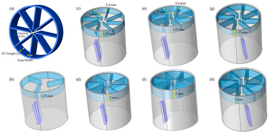 We then integrated the FC into the measurement channel. Based on the FC design proposed by Laws et al. [31], for a measurement channel diameter of 1 cm, the optimal flow conditioner length was set at D/8 = 1.25 mm, with a 2 mm opening. The vane width, constrained by the capabilities of the Form 2 3D printer (Formlabs, Somerville, MA, USA), was chosen at 40 µm, the minimum achievable with this printer. The structure of this design is illustrated in Figure 4a.