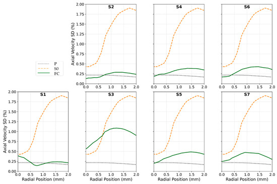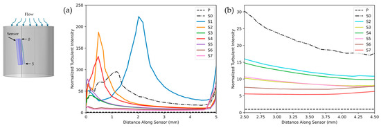 Figure 6a compares the turbulence intensity along the sensor position for various FC designs, with a zoomed-in view for enhanced comparison Figure 6b. P represents the measurement channel without the sensor with laminar flow, while S0 refers to the measurement channel with a sensor under turbulent flow conditions. S1 used the configuration in Figure 4b, featuring a D/8-length, three-vane Etoile FC with a 0.2D opening. S2 used a D/8-length, eight-vane, airfoil-shaped FC with a 0.2D opening (Figure 4c), and S3 extended this design by increasing its length to 2 mm (Figure 4d). Similarly, S4 followed the configuration in Figure 4e, incorporating a D/8-length, eight-vane Etoile FC with a 0.2D opening, while S5 was built on S4 by extending the FC length to 2 mm (Figure 4f). In S6, the structure of S4 was modified by repositioning the sensor between the vanes (Figure 4g), whereas S7 followed the same approach as S6 but applied it to S5, placing the sensor between the vanes (Figure 4h). For ease of comparison, all results were normalized against the TI value of laminar flow in the measurement channel (P).