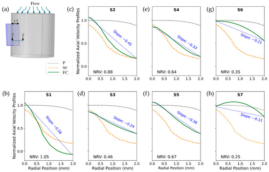 For enhanced comparison of different FC structures with respect to velocity homogeneity, we illustrate the slope of the line connecting the initial and final points of each velocity profile. Additionally, to capture the overall variation—particularly in structures such as S6 and S7, where the velocity increased from the starting point and then decreased—we report the normalized range of velocity (NRV). The NRV was defined as the difference between the minimum and maximum velocities within the profile, normalized by the corresponding laminar flow velocity in the pipe, and is presented in each figure.