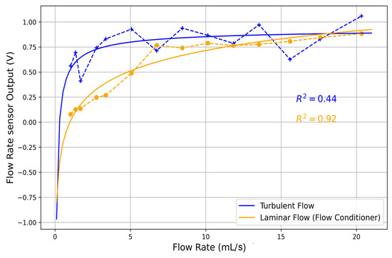 Following the above results, the eight-vane Etoile flow conditioner was chosen, 3D-printed, and installed in the measurement channel. Figure 8 presents experimental results, comparing the flow sensor output with and without FC across fluid flow rates ranging from 0 to 20 mL/s. Each point represents the mean of five measurements, with the solid line indicating the fitted curve.