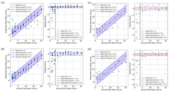 Predicted vs. actual flow rates and absolute error for SVM (a,c) and XGBoost (b,d) models on training (a,b) and test data (c,d). Source data and analyses available; see Data Availability Statement.