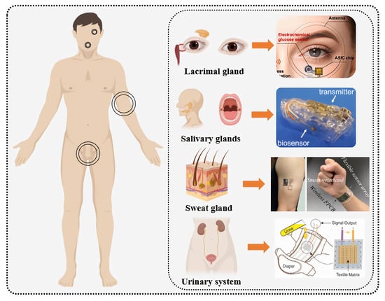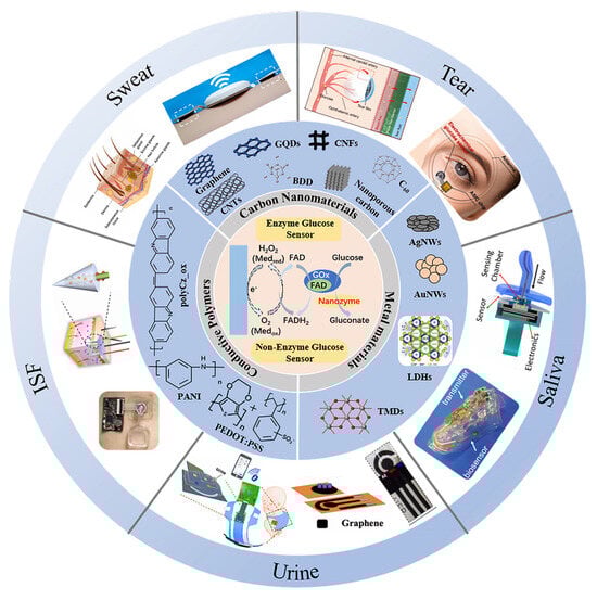 Wearable glucose sensors can be categorized based on the type of biological fluid used into non-invasive and minimally invasive types. Non-invasive fluids, such as tears, saliva, sweat, and urine, can be collected without penetration. Minimally invasive fluids, such as interstitial fluid (ISF), which exists in the extracellular space and is closely related to blood circulation, are examples of minimally invasive types. These biological fluids contain trace amounts of glucose, and measuring glucose levels in these fluids can indirectly reflect overall glucose levels. Due to their minimal impact on the body and reduced pain compared to traditional methods, wearable electrochemical glucose sensors based on biological fluids have become a popular topic in the next generation of blood glucose monitoring. See Figure 4.