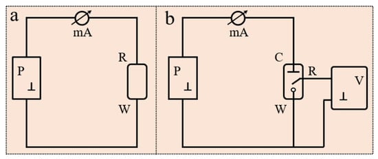 Electrochemical sensor configurations adapted for wearable fabric electrodes: (a) simplified two-electrode system; (b) conventional three-electrode system with separated RE/CE. Schematics redrawn from fundamental principles [131] with structural optimizations for textile integration (see Section 2.2).
