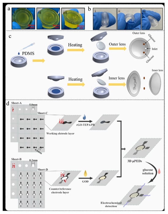 (a) Mold containing microfluidic channels: (i) schematic, (ii) top view, (iii) cross-sectional view [158]. (b) Schematic diagrams of the soft contact lens (SCL) under mechanical stress, bending, and different angles: (i) mechanical stress, (ii) bending, (iii) different angles [158]. (c) Lens molding process [158]. (d) A 3D paper-based microfluidic electrochemical biosensor: (i) hydrophilic zone, (ii) carbon working electrode, (iii) carbon counter electrode, (iv) carbon counter electrode, (v) Ag/AgCl reference electrode [159].