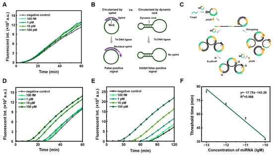 Comparison of PG-RCA between two methods for circularization of circular ssDNA templates. (A) Real-time record of PG-RCA at various concentrations of miR-155 using splint-aided circularization. (B) Schematic diagrams of two (splint-aided or splint-free) approaches for template circularization. (C) The mechanism of PG-RCA by using restriction enzymes (circular ssDNA is prepared by splint-free approach). “*” represents phosphorothioate modification. The green line represents the complementary region of the target, and the yellow line represents the extension of the target to the EcoRI-HF enzyme cleavage site region. (D,E) Real-time record of PG-RCA at various concentrations of miR-155 using splint-free circularization. PG-RCA conditions: 1 nM C1 for (B,D) or 0.1 nM for (E), 25 U/mL phi29, 50 U/mL EcoRI-HF, 1× SYBR Green II, 0.5× phi29 buffer, 0.5× rCutsmart buffer, 400 μM each dNTP, and incubation at 37 °C. (F) Calibration curve showing the linear relationship between the threshold time (Tt) and the logarithmic concentration (lgM) of miR-155, within the range of 10−13 to 10−10 M. Tt is the threshold time for amplification, defined as the time when fluorescent intensity exceeds the calculated threshold, like Ct values for RT-PCR.