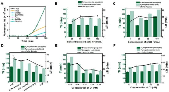 Optimization of conditions for dual RCA. (A) Efficiency of dual RCA compared with various controls. The label of (-) indicates the corresponding component is absent. (B) Effect of EcoRI-HF concentration on the threshold time (Tt) values. The dark green bars represent the Tt values for the 1 pM target group, while the light green bars correspond to the Tt values for the negative control group. The line graph illustrates the difference in Tt values between the target group and the negative control group. (C) Effect of phi29 concentration on Tt values. (D) Impact of various buffers on Tt values. Buffer A corresponds to the phi29 buffer, while buffer B corresponds to the rCutsmart buffer. (E) Effect of C1 concentration on Tt values. (F) Effect of C2 concentration on Tt values.