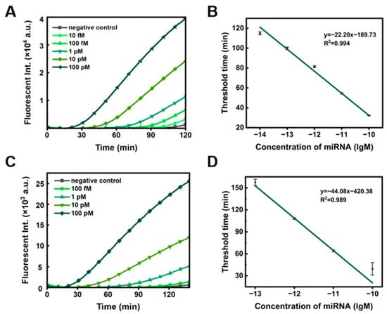 Sensitivity of the dual ssDNA ring system for miRNA detection. (A) Fluorescence intensity at various concentrations of miR-155. (B) Calibration curve showing the linear relationship between the threshold time (Tt) and the logarithmic concentration (lgM) of miR-155, within the range of 10−14 to 10−10 M. (C) Fluorescence intensity at various concentrations of miR-106. (D) Calibration curve depicting the linear correlation between Tt and lgM for miR-106, within the range of 10−13 to 10−10 M. Other reaction conditions: 0.1 nM C1, 10 nM C2, 25 U/mL phi29, 50 U/mL EcoRI-HF, 1× SYBR Green II, 0.5× phi29 buffer, 0.5× rCutsmart buffer, 400 μM each dNTP, and 37 °C.