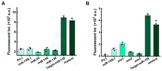 It is acknowledged that miRNAs exhibit a high degree of familial homology [,]. Therefore, detecting miRNAs requires methods with high specificity. We assessed the anti-interference ability of the system for miRNA detection. When non-target miR-20, miR-106, and miR-159 were added to the system targeting miR-155, significant fluorescence signals were detected only in the presence of the target miRNA-155 (Figure 4A and Figure S6A). Furthermore, when non-target miRNAs (miR-155, miR-159, and miR-20) were added to the system targeting miR-106, significant fluorescence signals were detected only in the presence of miRNA-106 (Figure S7). We also tested the specificity using miRNAs with mismatches (Table S1). Compared to the target miR-155, fluorescence signal of sequences with mismatches significantly decreased. For sequences containing a single mismatch, signals were slightly higher than those with double or triple mismatches (Figure 4B and Figure S6B). These results indicate that the dual RCA strategy exhibits excellent selectivity and specificity, demonstrating its potential for practical applications.