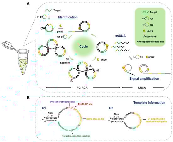 On the other hand, the detection of miRNA (a class of non-coding RNA, ranging from 19 to 25 nucleotides in length) is essential in the fields of biological and medical research []. miRNA plays an important role in gene regulation, disease diagnosis, and drug development. For example, the binding of miRNA promotes mRNA degradation and plays a crucial role in post-transcriptional gene regulation []. For some diseases, the expression of corresponding miRNA becomes more or less, and an increasing number of studies show the potential of miRNA as a diagnostic biomarker [,]. Among them, miRNA-155 is a well-studied miRNA, which has been shown to be associated with various cancers and diseases, such as breast cancer [], asthma [], and diabetes []. However, the high-sensitivity detection of miRNA remains challenging due to its short sequence length, high homology within families, and low sample abundance. There are various methods for detecting miRNA, such as Northern blotting [] and reverse transcription quantitative polymerase chain reaction (RT-qPCR) [,]. However, applications of these methods are limited by the need for special equipment. Moreover, these methods are complex, time-consuming, and expensive, which means they are not suitable for rapid miRNA detection. Various isothermal nucleic acid amplification techniques have been developed, such as rolling circle amplification (RCA) [], loop-mediated isothermal amplification (LAMP) [], recombinase polymerase amplification (RPA) [], and exponential amplification reaction (EXPAR) []. Among them, RCA has been widely applied in biology, medicine, and food safety testing due to its excellent biocompatibility and programmability []. Several miRNA detection techniques combining RCA with other methods have been developed, such as RCA-LAMP for detecting let-7a [], RCA-CRISPR/Cas9 for detecting miR-21 [], RCA-Cas12a for detecting miR-10b and miR-21 [], and RCA-APE1 for detecting miR-206 []. Although these methods improve the sensitivity and specificity of RCA, they require integration with other technologies and involve complex designs and procedures.