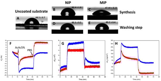 (A–E) Contact angle measurements acquired at room temperature (22 ± 1 °C). Water droplet profiles on QCM-D gold-coated surfaces: (A) unmodified surface, (B) surface coated with non-imprinted polymer (NIP), (C) surface coated with molecularly imprinted polymer (MIP), (D) NIP surface after QCM negative test with 5% acetic acid, and (E) MIP surface after QCM template-removal test using 5% acetic acid. (F–H) QCM-D analysis at the ninth overtone, performed at room temperature (22 ± 1 °C). Real-time responses of MIP-coated (red curves) and NIP-coated (blue curves) gold sensors upon exposure to 5% acetic acid solution (flow rate: 100 μL/min), followed by a final PBS rinse at the same flow rate. Panels show (F) frequency shift (Δf), (G) dissipation change (ΔD), and (H) mass change.