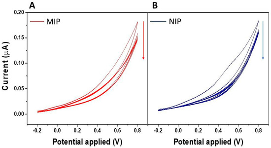 A single-layer PSi structure was fabricated to act as the optical transducing platform. The PSi was made by electrochemically etching an n-type crystalline silicon wafer. The resulting PSi monolayer exhibited a porosity of approximately 61%, a thickness of 2.1 µm, and a pore size distribution ranging from 50 to 250 nm [43]. The 61% porosity and the 50–250 nm pore-size range supply a large internal surface area for imprinting while creating channels wide enough for the IL-6 molecule to diffuse rapidly in and out of the polymer matrix. At the same time, the 2.1 µm film thickness preserves the interferometric fringe pattern required for optical read-out. MIP-film was synthesized by cyclic voltammetric deposition (5 scans) of o-PD in the presence of IL-6 into PSi devices (Figure 2A). Figure 2 reports a typical cyclic voltammogram recorded during the electro-polymerization of o-PD in the presence of IL-6. A significant decrease in the anodic peak was observed from the 1st to the 5th cycle, indicating irreversible monomer oxidation on the electrode surface during continuous cycling and demonstrating the formation of a non-conductive polymer film on the electrode surface. Similar trends were observed in the cyclic voltammogram evolution both in the presence of IL-6 (MIP, Figure 2A) and its absence (NIP, Figure 2B), indicating that only the monomer underwent electro-polymerization.