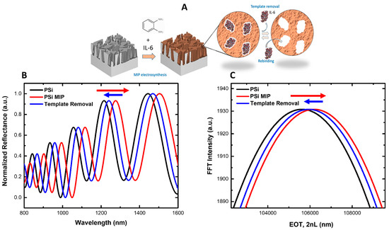 After this preliminary characterization, the system was characterized using optical measurements at three critical stages: after PSi fabrication via electrochemical etching, immediately after MIP deposition, and following template (IL-6) removal using a 5% acetic acid solution in water. Reflectance spectra were recorded at each stage to assess structural and refractive index variations, allowing real-time monitoring of shifts in the photonic resonance of the PSi layer. These spectral shifts indicate changes in the effective refractive index within the porous structure (Figure 3B). A clear redshift of 60 nm in the reflectance peak was observed after electropolymerization, confirming the successful deposition of the MIP layer compared to the bare PSi substrate. This shift can be attributed to the infiltration of the non-conductive polymer matrix into the porous network, effectively increasing the overall refractive index [2,43]. After the template removal in acetic acid 5%, a noticeable blue shift (30 nm) in the reflectance peak was detected. The removal of the template protein from the polymer cavities reduces the mass within the pores and thus lowers the local refractive index. Consequently, the reflectance spectra shift back to shorter wavelengths, proving that IL-6 had been successfully removed, thereby exposing the imprinted binding sites. Finally, the reflectance spectra were also analyzed using Fourier Transform analysis, which confirmed the redshift after MIP electrodeposition and the blue shift after the template removal (Figure 3C).