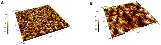 It is important to note that following the 60 nm red shift observed after MIP electropolymerization, a 30 nm blue shift was recorded upon template removal, reflecting the extraction of IL-6 and the resulting decrease in refractive index within the PSi layer. It is worth noting that the polymer electrosynthesis process involved the use of 100 µg/mL of o-phenylenediamine (o-PD) and the addition of 100 µL of IL-6 at a concentration of 100 µg/mL, ensuring that the PSi matrix was partially occupied by both the polymer and the target template. Consequently, upon the template-removal step, the extraction of IL-6 from the MIP structure reduced the overall refractive index within the porous layer, leading to the observed blue shift. This outcome aligns with the expected behavior of the MIP-modified PSi system, wherein target removal manifests as a decrease in refractive index and a corresponding shift in the reflectance spectrum. The surface topography of PSi, both before and after MIP functionalization, was examined using AFM, as shown in Figure 3. In Figure 4A, the AFM images of the bare PSi (without MIP) exhibit characteristic hillocks and voids, with the voids (dark regions) measuring around 100 nm in diameter and uniformly distributed across the substrate. These features confirm the intrinsic porous nature of the PSi, providing a high surface area that is potentially advantageous for subsequent biomolecular recognition. In contrast, Figure 4B demonstrates the morphological impact of MIP functionalization.
