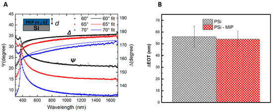 (A) Measured (dots) and calculated (solid lines) Y and D spectra of MIP deposited on a silicon substrate. Spectra were acquired at the incidence angles 60°, 65°, and 70°. In the inset ellipsometric model of MIP deposited on silicon, measured (dots) and calculated (solid lines) Y and D spectra of MIP deposited on a silicon substrate. Spectra were acquired at the incidence angles 60°, 65°, and 70°. (B) ΔEOT analysis following the IPA filling test on bare PSi and MIP-modified PSi. The optical measurements are obtained from a minimum of three independent samples (n ≥ 3). SDs are reported as vertical bars.