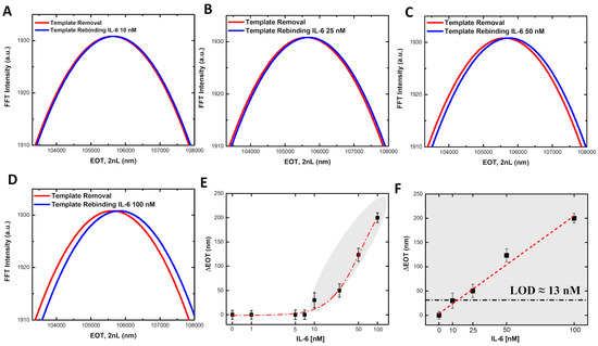 (A–D) FFT analysis of reflectance spectra after the template removal (red line) and after the template rebinding with different concentrations of IL-6 (blue line). (E) Calibration curve of IL-6 in standard solution, on x-axis IL-6 concentrations in [nM], on y-axis ΔEOT values calculated as EOTIL-6 − EOTblank. (F) Linear Range of biosensor. The gray area in panels E and F indicates the linear dynamic range of the biosensor, where the optical response shows a direct proportionality to IL-6 concentration. The optical measurements are obtained from a minimum of three independent samples (n ≥ 3). SDs are reported as vertical bars.