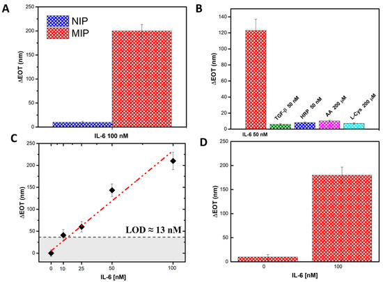 To evaluate the performance and specificity of our biosensor, the highest concentration of IL-6 (100 nM) was incubated with PSi modified with a non-imprinted polymer (NIP). Reflectance spectra were acquired, and the EOT values were calculated using FFT analysis. As shown in Figure 7A, no significant shift in the reflectance signal was observed for the NIP-functionalized PSi after incubation with IL-6, in contrast to the MIP-functionalized PSi, which exhibited a clear shift. This confirms that the NIP does not recognize or bind IL-6, further validating the specificity of the MIP-modified sensor.
