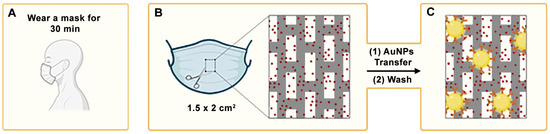 A schematic representation of the main steps required to diagnose neutrophilic inflammation in airways with the proposed methodology: (A) the facemask becomes imbued with myeloperoxidase as the patient breathes; (B) the intermediate polypropylene layer is isolated; (C) antibody-coated nanoparticles (represented as the yellow circles) are transferred from a reservoir in a paper decal. After washing, nanoparticles bound by antibody–antigen interactions generate a colored spot on the facemask. AuNPs: gold nanoparticles.