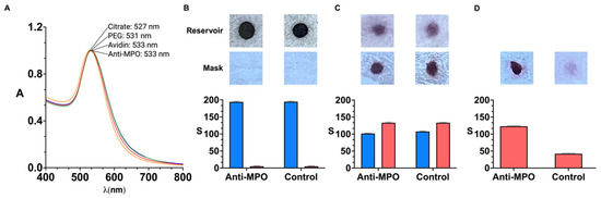 Nanoparticles were modified with PEG by means of strong thiol–gold interactions. The resulting PEGylated nanoparticles have demonstrated long-term stability under a range of environmental conditions [26,27,28]. Avidin was attached to the nanoparticles by means of irreversible amide bonds between carboxylate groups on the nanoprobes and amine groups on the protein. Antibodies were then grafted to the nanoparticles by strong biotin–avidin interactions. The optimization of the antibody concentration around the nanoparticles is detailed in Figure S1 in the Supplementary Materials. Of note, extinction spectra in Figure 2 show slight red-shifts and no widening after each modification step, which is in agreement with the spectral properties of non-aggregated nanoparticle dispersion. Furthermore, images in Figure 2B–D show red-colored spots, which suggests that the nanoprobes do not aggregate even after drying them in the polyelectrolyte-filled paper reservoir.