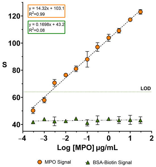 As shown in Figure 3, anti-MPO nanoparticles produce a clear dose-dependent signal between 3 · 10−4 and 3 · 101 µg·mL−1. The calibration curve followed the linear regression equation y = 14.32x + 103.1, with a coefficient of determination r2 = 0.9940 and a slope p-value of p < 0.0001, indicating excellent linearity (raw data shown in Table S1). In contrast, BSA-coated nanoparticles yield a very low and concentration-independent signal, described by the calibration equation y = 0.1698x + 43.19, with an r2 of 0.08, and a slope p-value of p = 0.3904, indicating no significant dose–response relationship. These results confirm the high specificity of the anti-MPO nanoprobes for their target. The dotted line in Figure 3 marks the limit of detection (LOD), defined as the signal of the blank plus three times the standard deviation (3σ criterion, 99% confidence). The first point in the calibration plot above this signal is 3 · 10⁻3 µg·mL−1.
