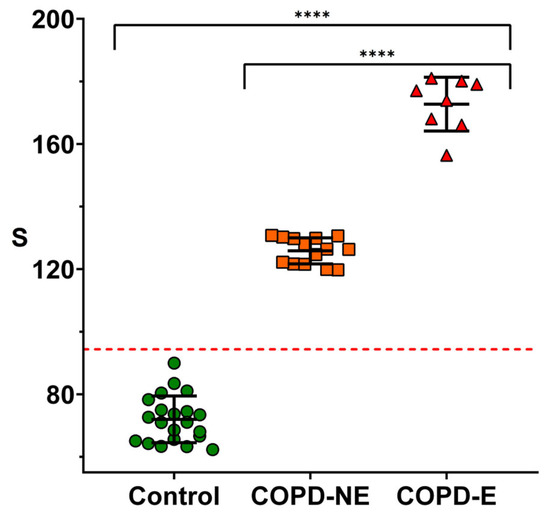Detection of MPO on masks worn by volunteers using nanoparticles coated with anti-MPO. Healthy individuals (control, green dots), stable COPD patients (COPD-NE, orange squares), and COPD patients during exacerbation (COPD-E, red triangles) are shown. Error bars represent standard deviation for each group. Dotted line indicates limit of detection (3σ criterion). S refers to colorimetric signal of colored dots quantified using ImageJ. Statistical analysis was performed using one-way ANOVA. Significant differences are indicated: “**** p < 0.0001”.