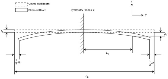 In Figure 3, the thickness of the beam is the sum of the handle layer thickness of the sensor and the device layer thickness of the sensor. The length of the beam is the length of the MEMS die. The terminals of the variable capacitors are positioned at a distance from the symmetry plane, and the vertical displacement at the terminals is denoted as . The external strain is represented by prescribing a displacement to the bottom edge of both sides of the beam. This gives us the second boundary condition of the system. The input strain to the beam is then represented as: