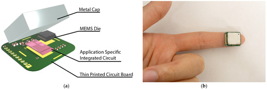 Strain sensing system: (a) The strain sensing system includes the MEMS die, an application-specific integrated circuit, a thin printed circuit board, and a metal cap. The complete strain sensing system features a form factor of 15 mm × 17 mm × 3 mm. (b) An image showing the small form sensor placed on the fingertip.